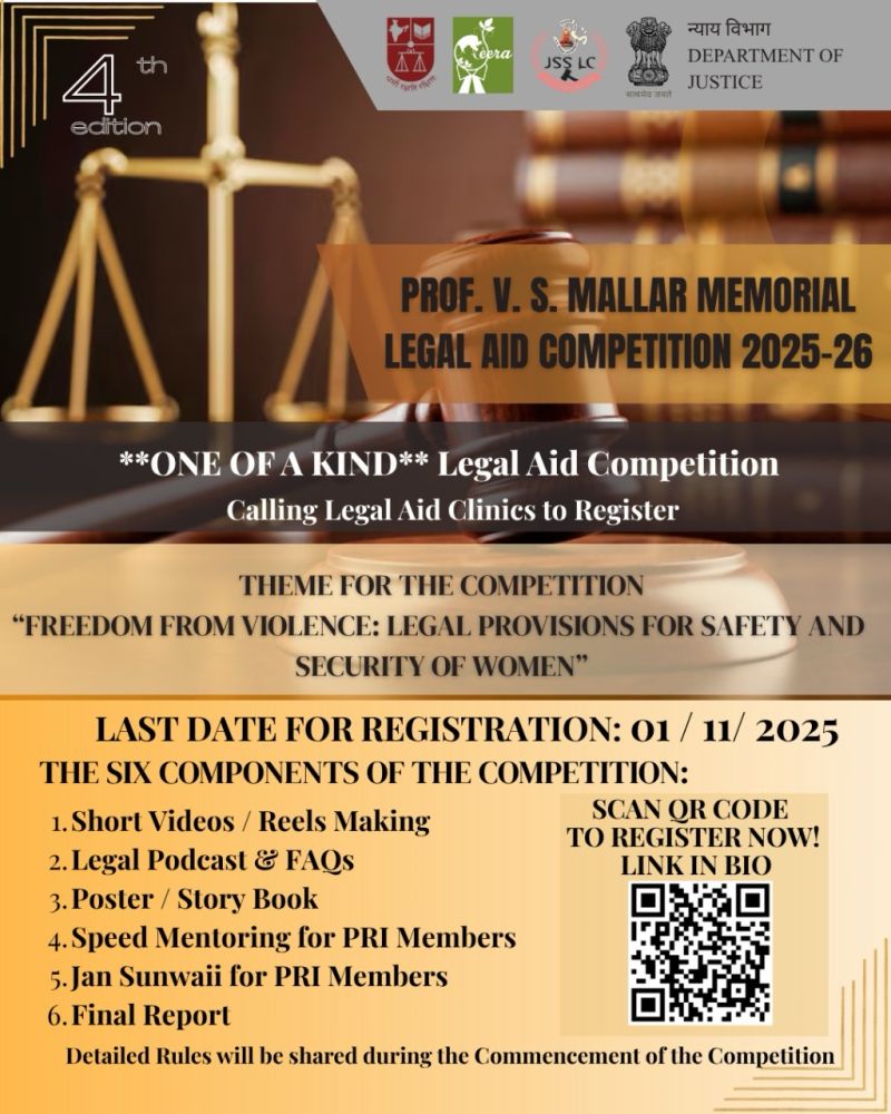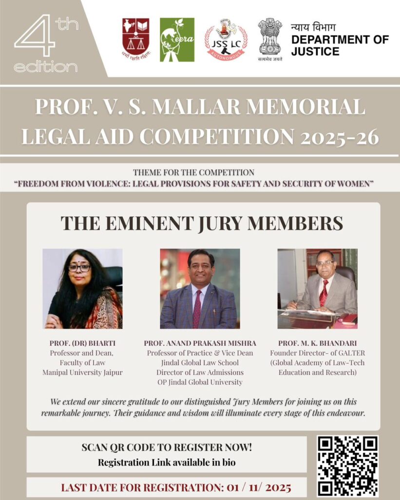 JSS Law College (Autonomous), Mysuru, in collaboration with CEERA, NLSIU Bengaluru, and the Department of Justice, proudly hosts the 4th Edition of the Prof. V. S. Mallar Memorial Legal Aid Competition (2025–26).